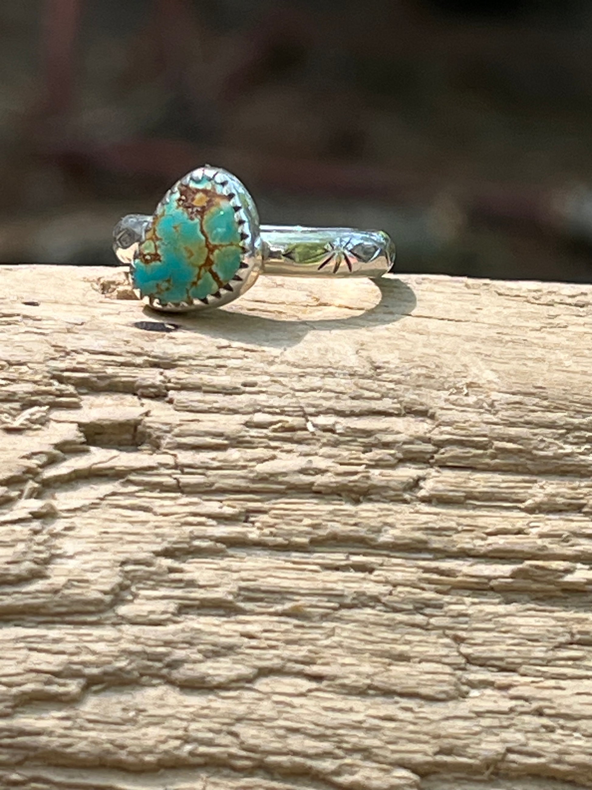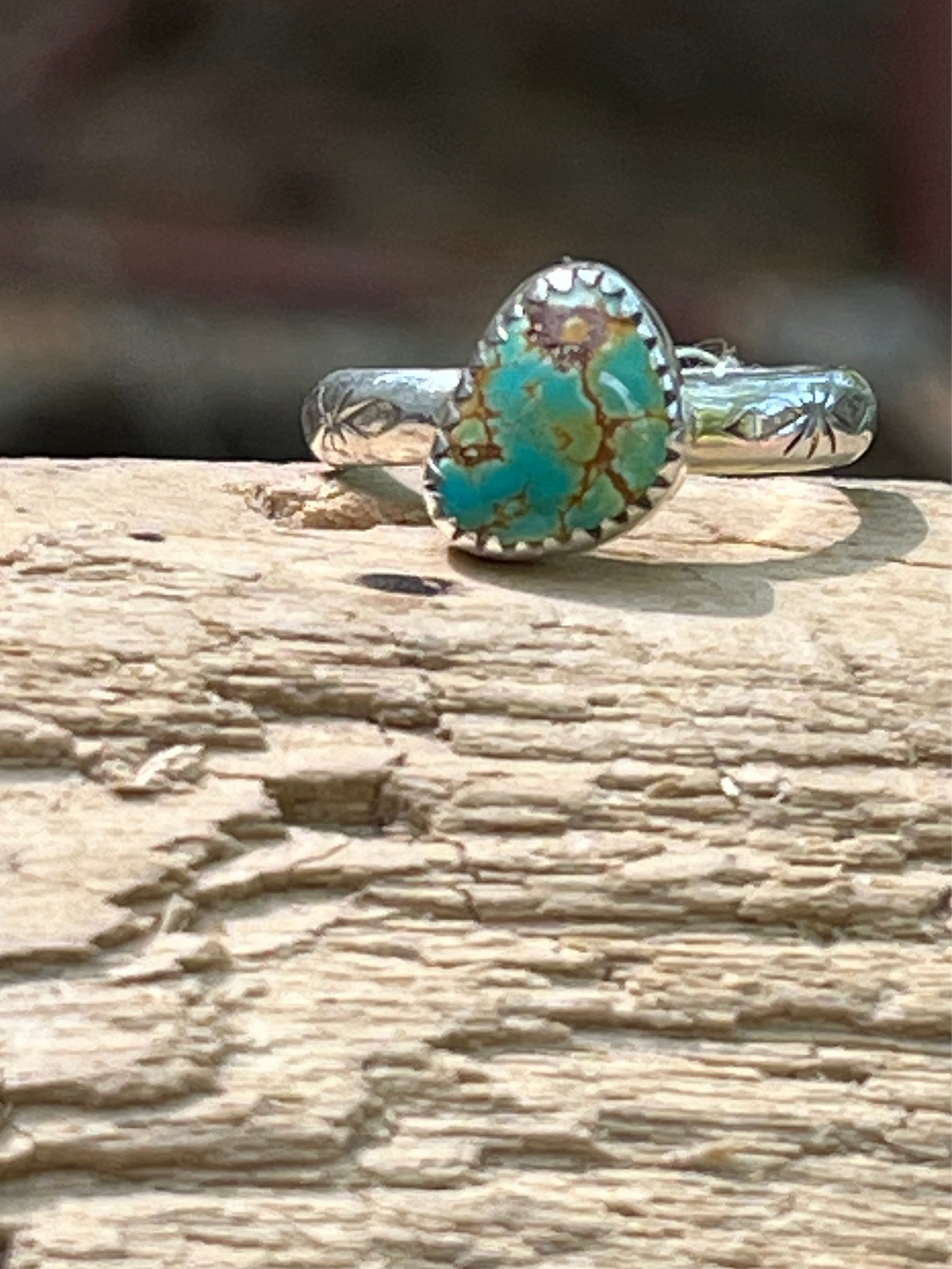 Handmade high grade rattlesnake turquoise and sterling silver hand stamped band “stacker”ring-size 6