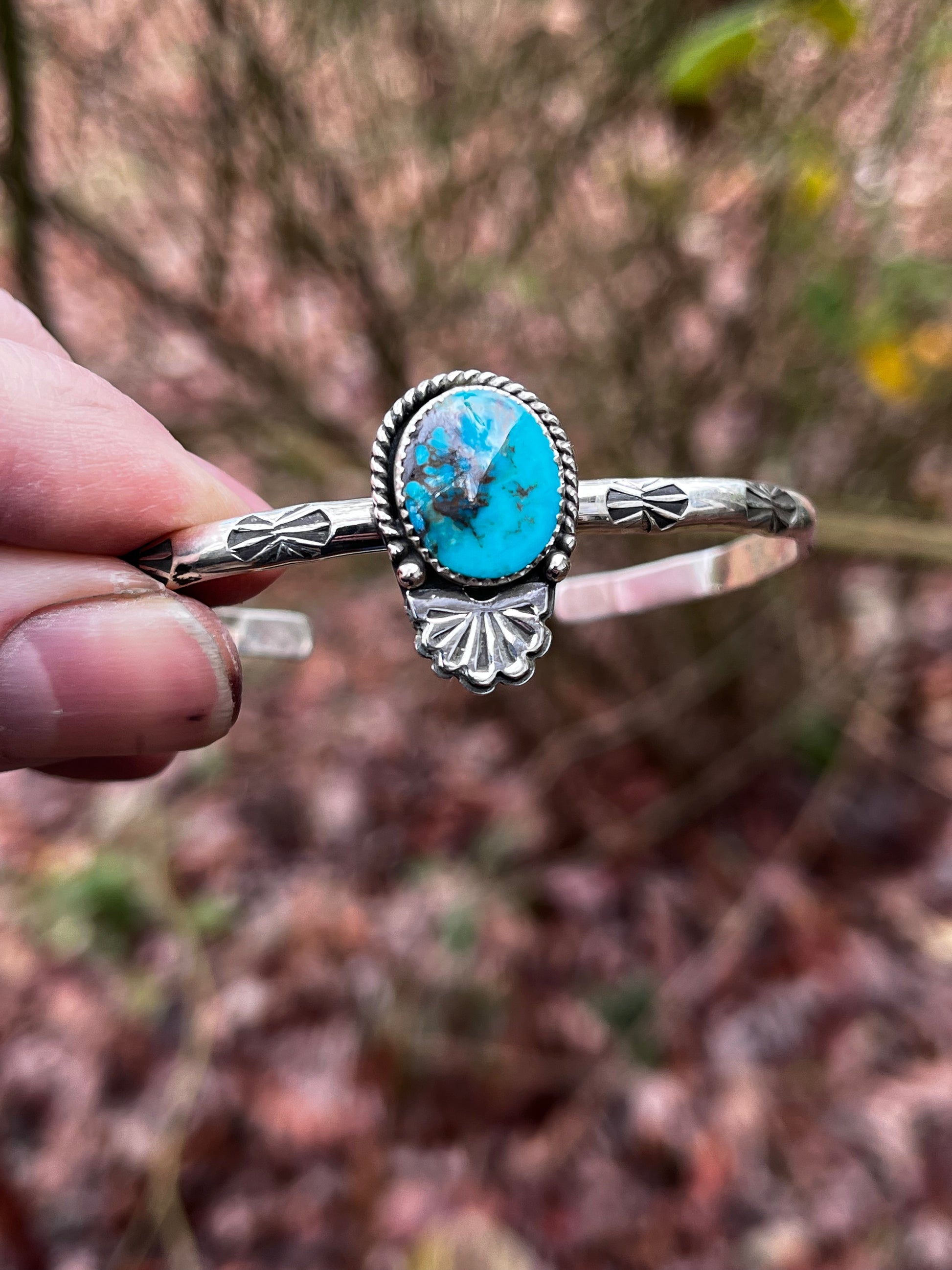 Handcrafted 6 inch with a 1 inch gap Kingman Turquoise with sterling silver cuff bracelet Hand stamped
