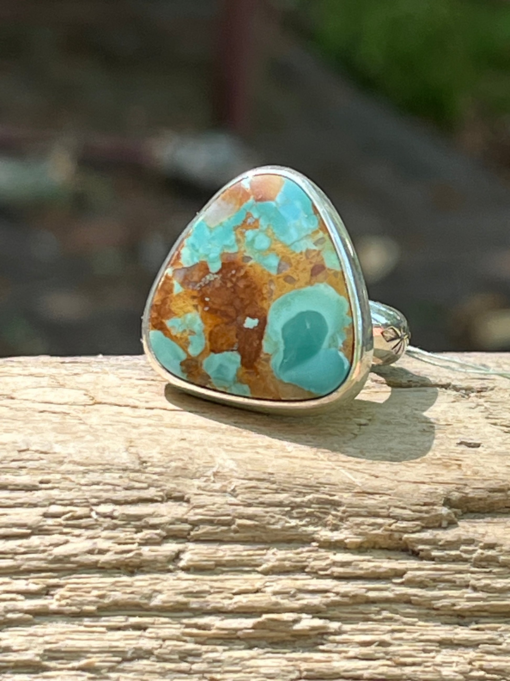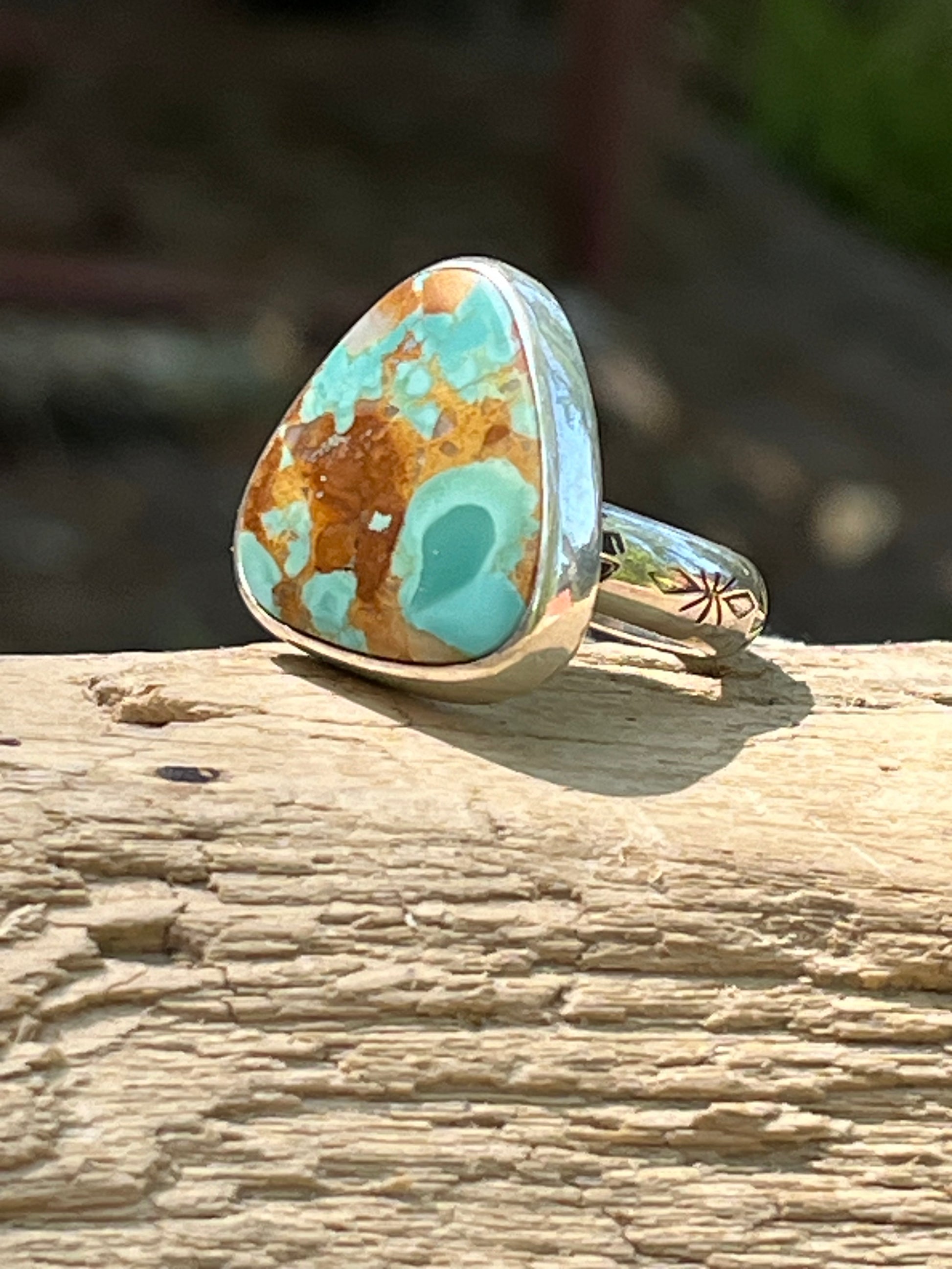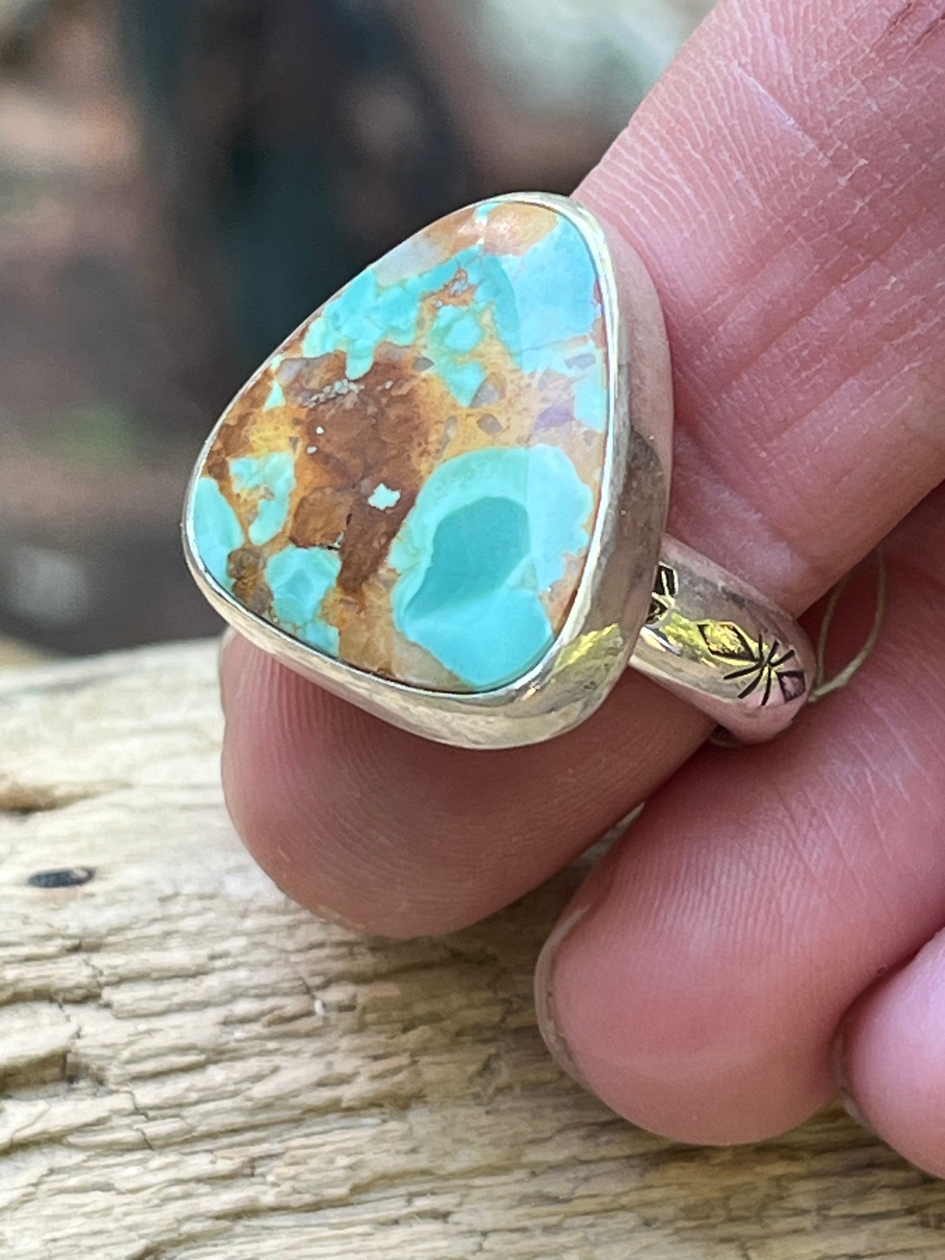 Handmade Pilot Mountain turquoise and sterling silver hand stamped “thicker”band ring-size 8